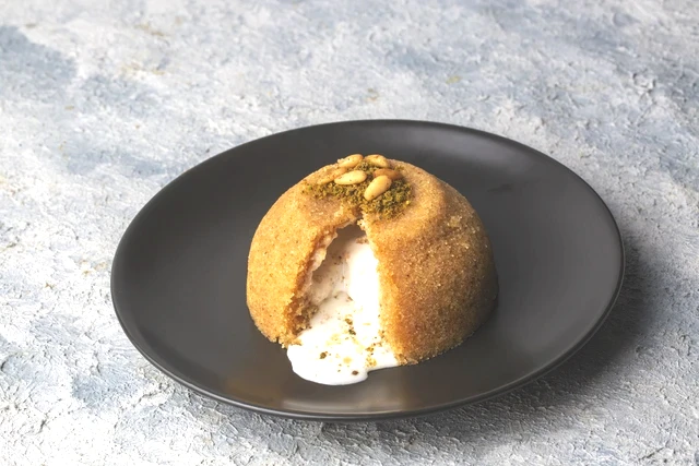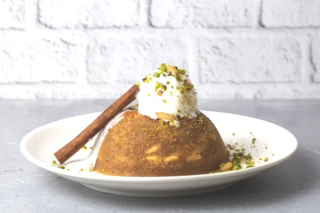 Servis için küçük bir kaseye streç film serin. İçine ılık helvadan koyup ortasını çukurlaştırın. Çukura dondurma yerleştirip üzerini tekrar helva ile kapatın. Kaseyi ters çevirerek servis tabağına yerleştirip hemen servis yapın.